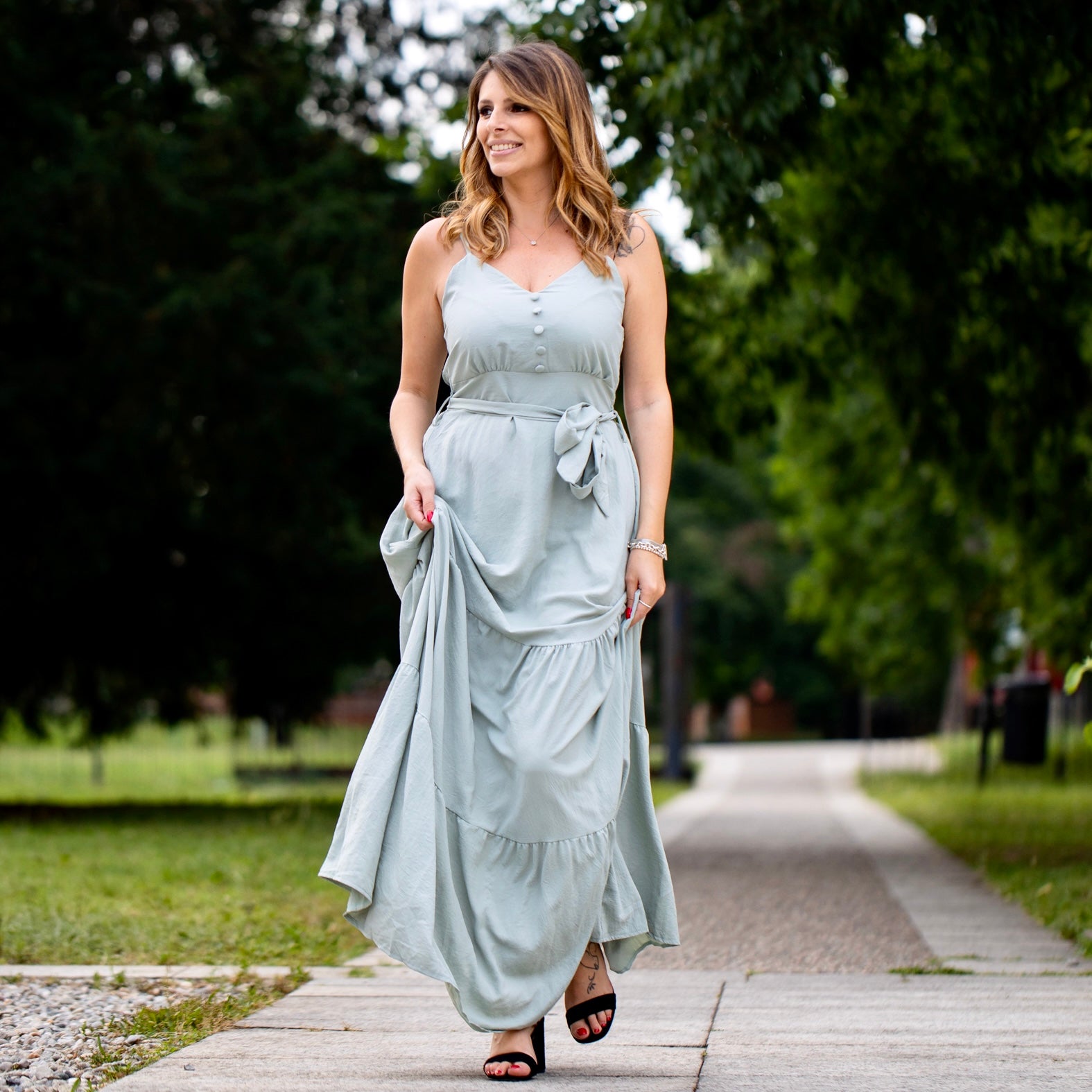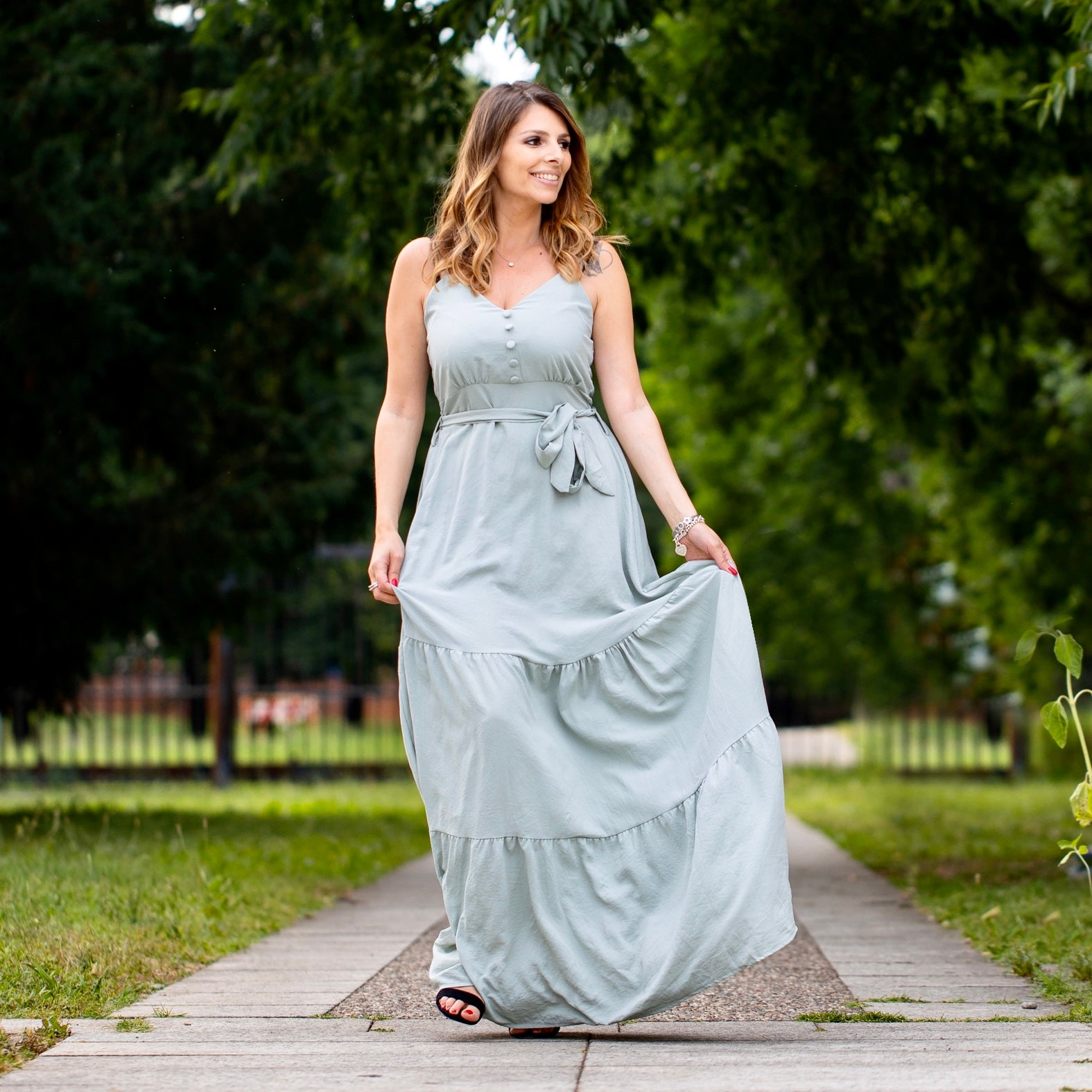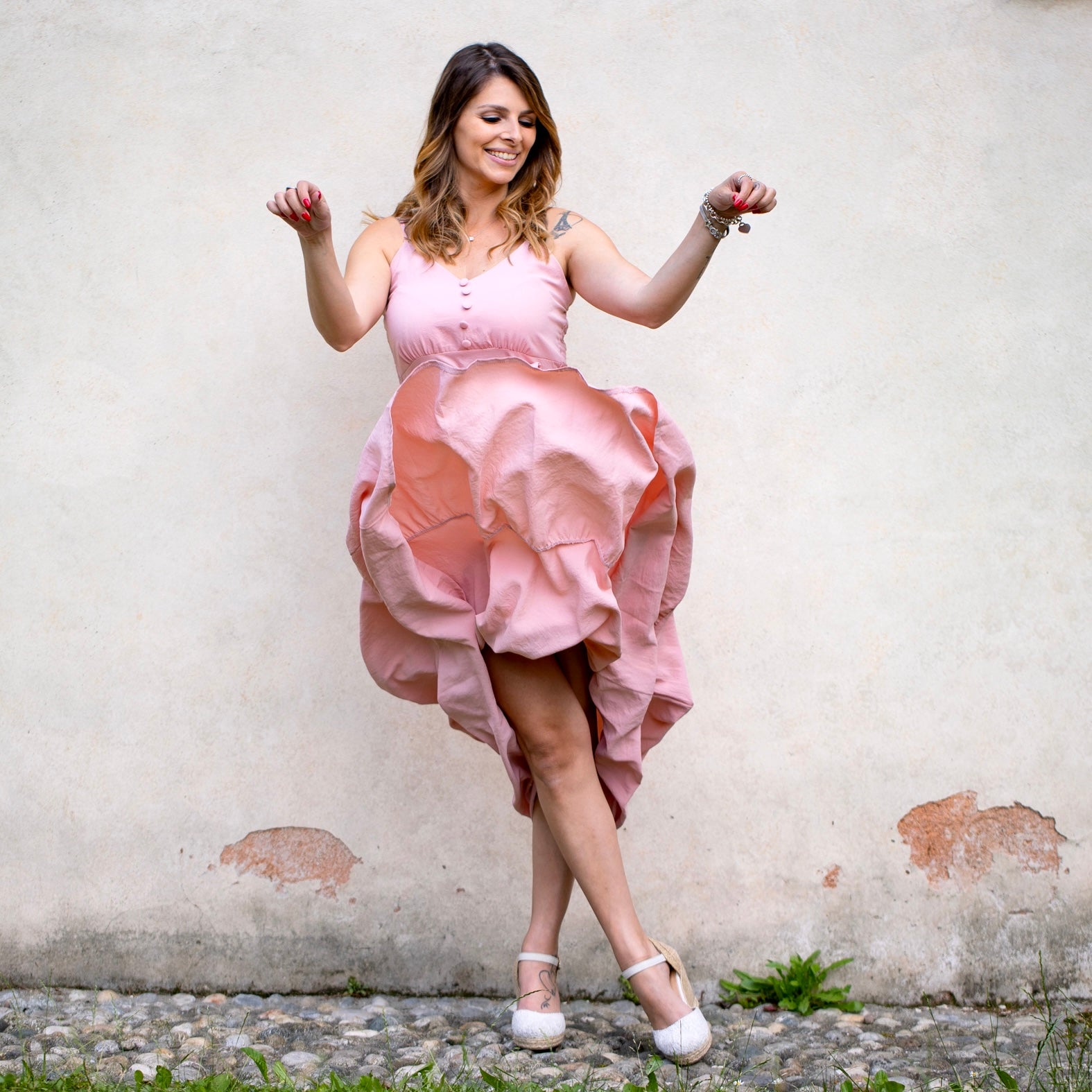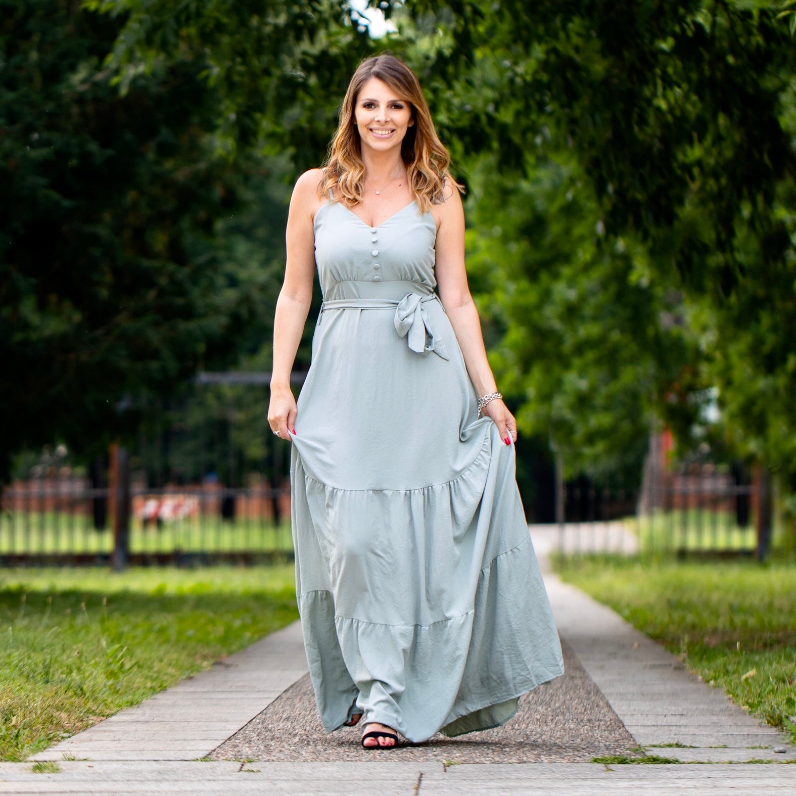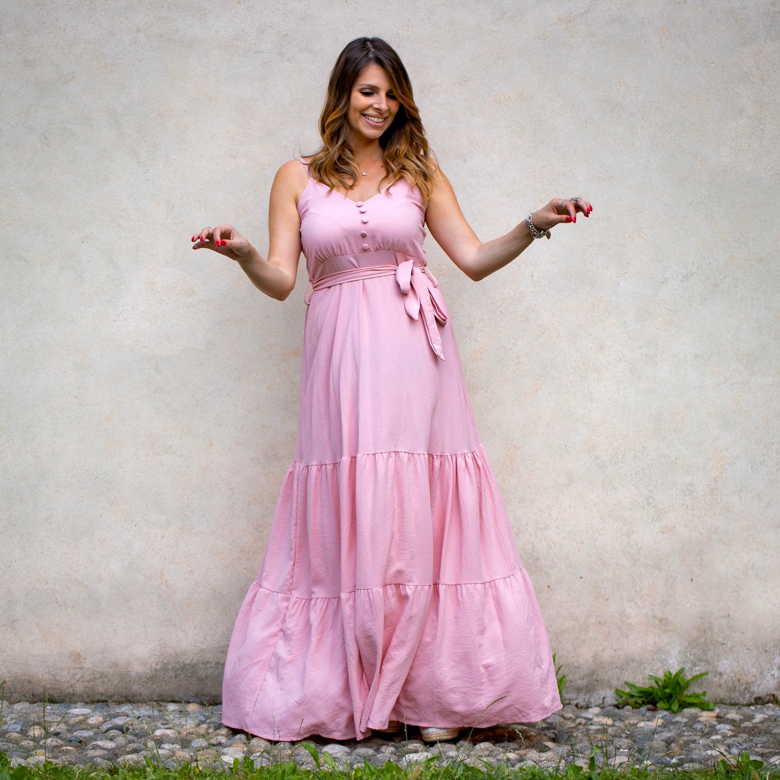 Abito lungo leggerissimo, finti bottoni sul petto, cinturino in vita, spalline regolabili e ed elastico sulla schiena. 65% poliestere e 35% cotone. Vestibilità morbida fino ad una taglia 44. Nelle foto viene indossata una taglia XS/S. Made in Italy.